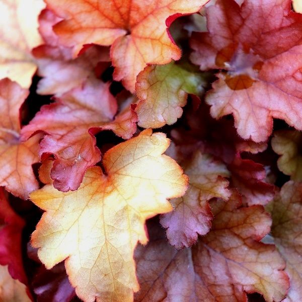 Compact and clump-forming, Heuchera is distinguished by its colourful, lobed foliage that adds texture to the garden. ‘Peach Flambé‘ pbr stands out with its rich apricot, gold and peach shades. In spring, it produces tall, delicate heads of small white flowers that rise above the foliage, adding an elegant touch to garden settings.